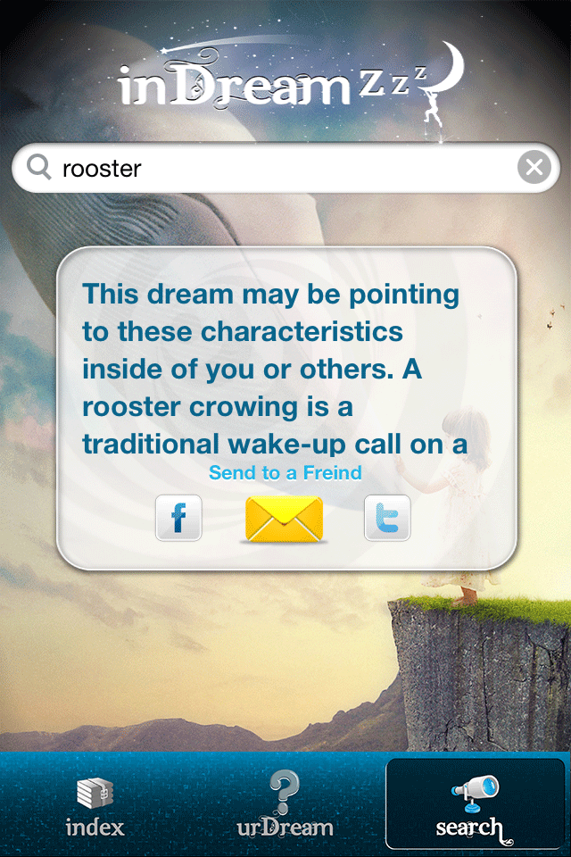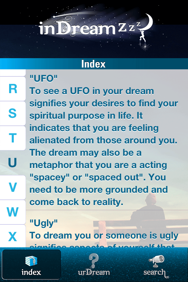 InDreamZzz app is a unique and dynamic app, lets you effortlessly keep a record of what you search for. Based on your Dreams, InDreamZzz recommends you to use more "UrDream" (An online Interpretations and human based).
